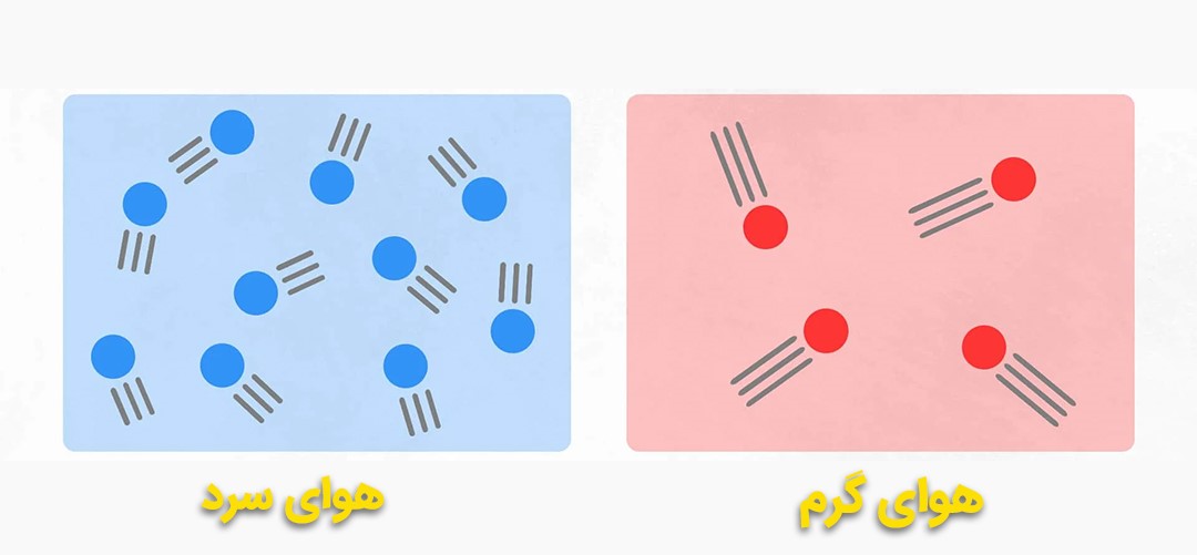 وقتی مولکولهای هوا دمای سرد را تجربه میکنند، به آرامی حرکت میکنند و به همدیگر نزدیک میشوند و فضای فیزیکی کمتری را اشغال میکنند. در دماهای گرمتر، مولکول های هوا به سرعت حرکت می کنند و بیشتر پخش می شوند و فضای فیزیکی بیشتری را اشغال می کنند.